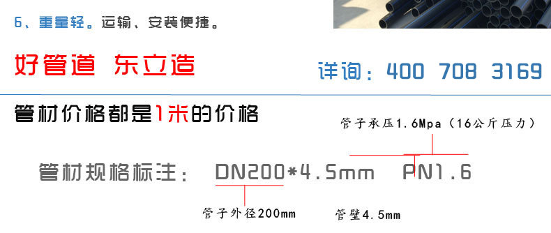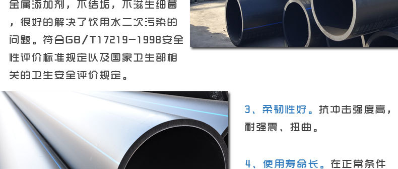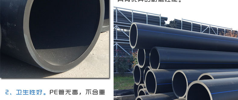 PE給水管內(nèi)壁光滑,且不隨使用時間變化,摩擦阻力小,節(jié)省能源,壓力損失比鋼管約小30%,可選用比鋼管小的口徑。衛(wèi)生性能好,無添加劑,沒有污染飲用水的可能性,ISO標準定級聚乙烯材料為0級(最低級),不生霉材料,與其他一些常用塑料材料相比,聚乙烯的耐霉菌性能要高很多,長期使用也不積垢。